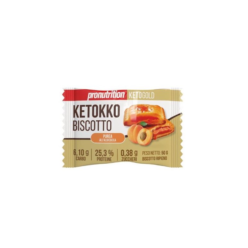 Il Ketokko Pronutrition Albicocca è un biscotto di pasta frolla keto con ripieno cremoso di purea all’albicocca, senza zuccheri aggiunti.