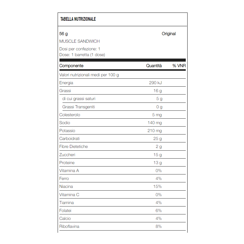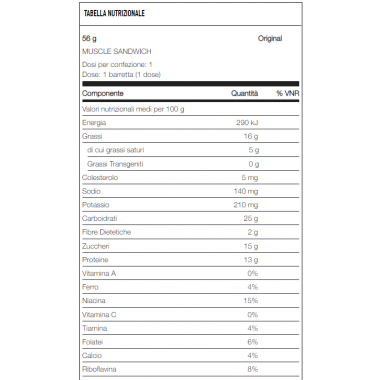 Muscle Sandwich Bar è una fantastica barretta proteica con burro d’arachidi ricca in proteine e acidi grassi essenziali. Un wafer ricoperto al cioccolato bianco e cioccolato al latte bilanciata tra proteine e carboidrati. Muscle Sandwich è stata formulata da esperti chef per arrivare a realizzare questa barretta dal gusto unico crunchy grazie ai ben due strati di wafer da cui è composta apportando tutto il supporto energetico di cui hai bisogno. Ecco perché il team di Muscle Sandwich ha prodotto questa barretta in due differenti tipi di gusto: original e vaniglia. Ogni barretta è stata realizzata esclusivamente con vero Burro D’arachidi e wafer a basso indice glicemico, apportando 13 grammi di proteine della massima qualità e una fonte naturale di acidi grassi essenziali EFA. Perché scegliere Muscle Sandwich? I due ingredienti principali che costituiscono questa gustosa barretta sono: le proteine del siero del latte isolate, conosciute anche come Whey Protein, e il Burro d'Arachidi. Le Whey Protein sono considerate la fonte proteica più nobile in assoluto e dall’alto valore biologico, vengono estratte dal latte e grazie al metodo di produzione utilizzato, denominato processo di microfiltrazione a flusso incrociato, riescono a mantenere intatti tutti i nutrienti presenti in essa consentendo alle frazioni proteiche di stimolare la sintesi proteica e favorire l’anabolismo muscolare. Inoltre questo processo permette alle proteine di avere una maggiore digeribilità. Il secondo elemento di questa barretta è il Burro D’Arachidi un alimento ipercalorico ottenuto dalla macinazione dei semi di arachidi è stato introdotto grazie alle sue caratteristiche nutrizionali elevate Ricco in proteine, acido oleico, vitamina b3, acido folico, arginina, magnesio e acidi grassi essenziali Efa considerati fondamentali per lo sviluppo della membrana cellulare e per rafforzare il sistema immunitario oltre alle sue capacità anti infiammatorie. Oltre alle proteine del siero del latte e al burro di arachidi, per andare incontro ad ogni tipo di esigenza nutrizionale, Muscle Foods ha aggiunto nella preparazione di questa barretta un elevata percentuale di fibre, caratteristica che rende il prodotto idoneo per lo spuntino di metà mattina o di metà pomeriggio consentendo di colmare il senso di fame senza inficiare l’apporto proteico o calorico. Vediamo in breve le caratteristiche di Muscle Sandwich: 13 grammi di proteine per barretta; ricche di fibre; ideale per sostenere il bilancio dell'azoto positivo; spezza la monotonia della dieta; gusto delizioso e croccantezza.