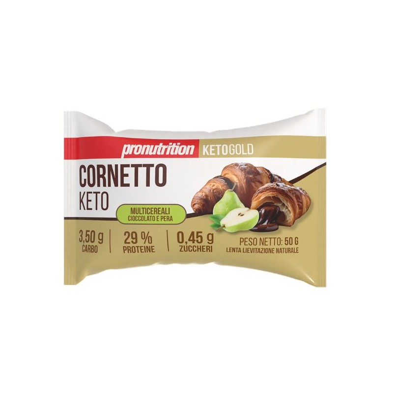Un cornetto chetogenico ai multicereali con ripieno di crema al cioccolato e pera, realizzato dai laboratori pasticceri Pronutrition.